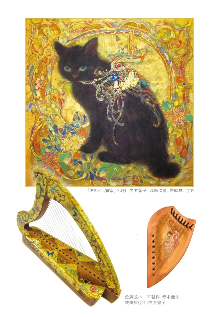 今回はこのような、アイリッシュ・ハープ奏者、製作者と日本画家の夫婦ならではの作品を多数展示しています。会期中は毎日手作りのハープを演奏しております(無料、予約不要)。
