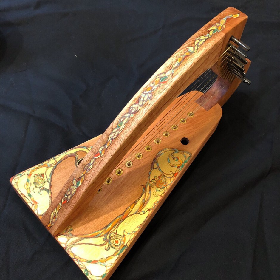 また、私の手作りアイリッシュ・ハープに日本画の絵具で絵付けしてもらったものもあり、世界でただひとつだけの作品となっています。