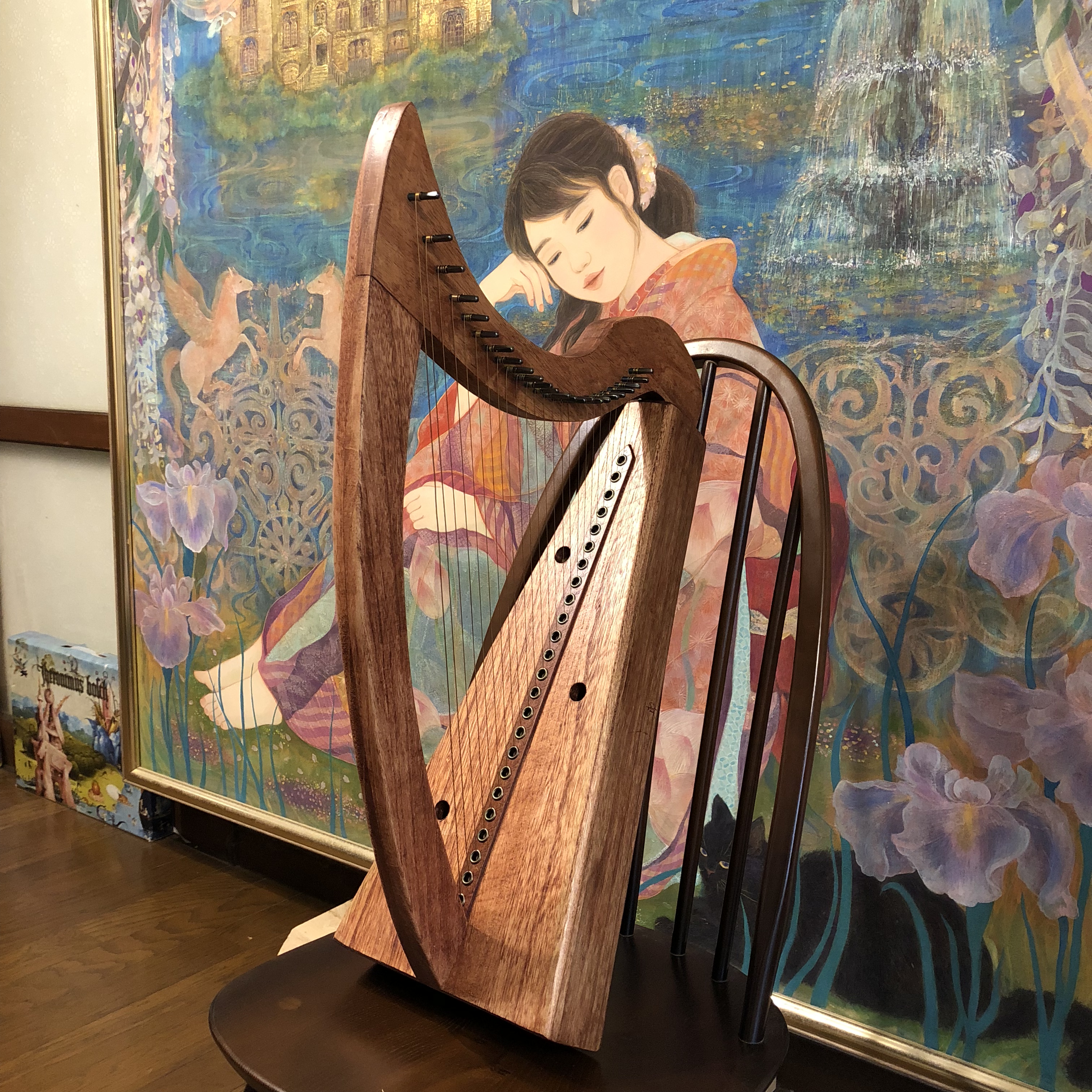 使用するのは私が製作している小さな金属弦ハープ。ハープ製作、購入予約についてのご相談も承ります。