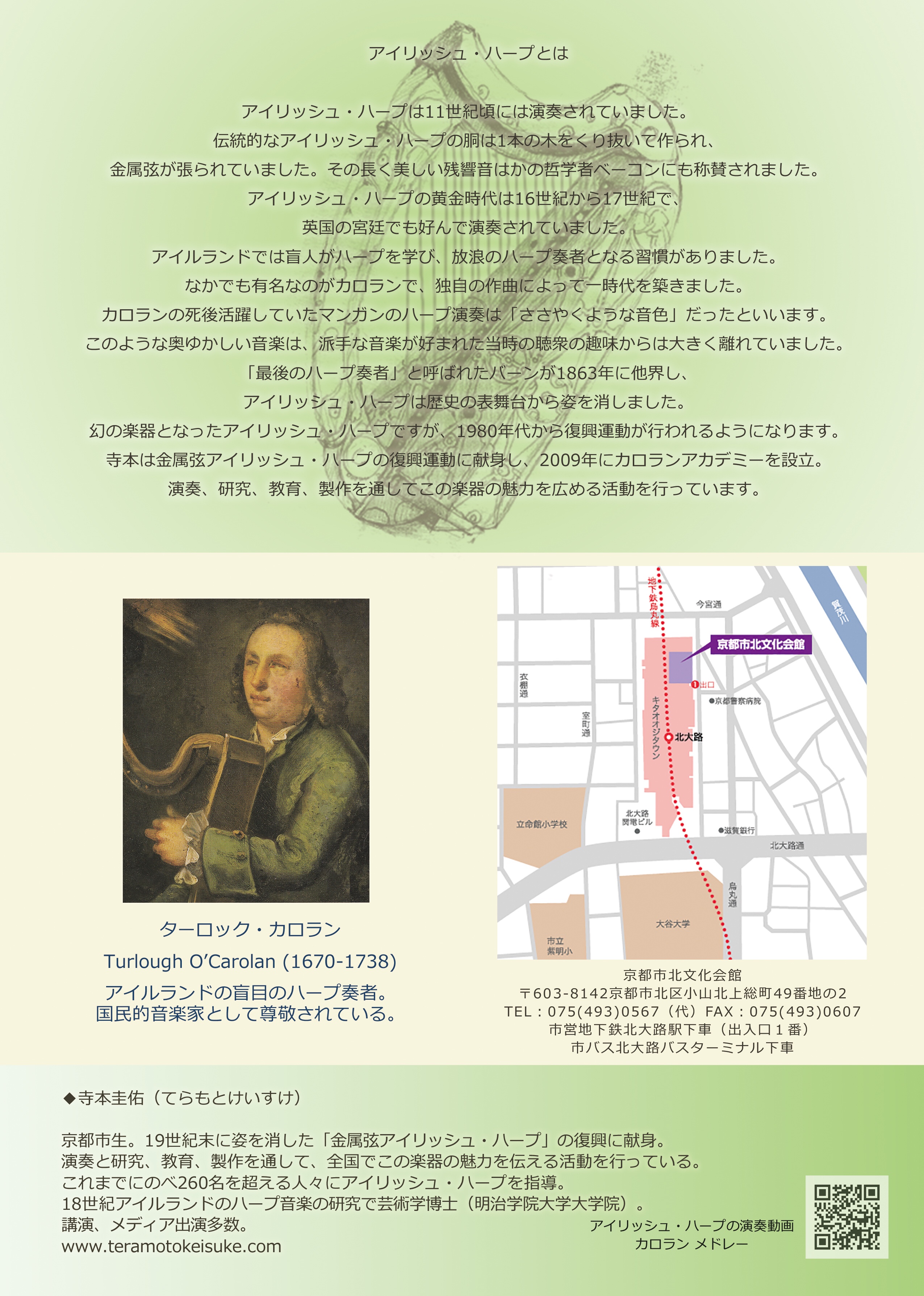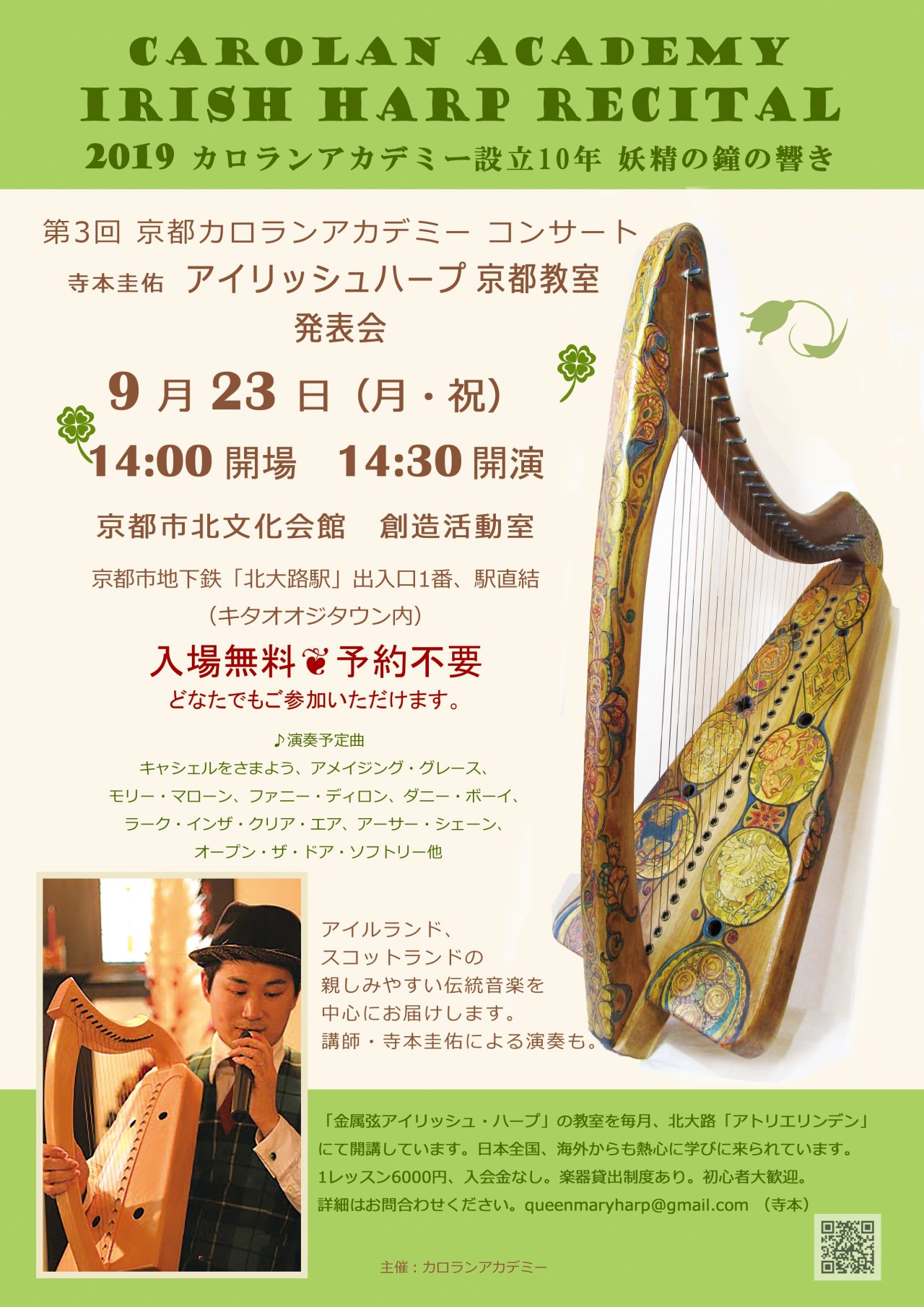 寺本圭佑アイリッシュ・ハープ京都教室の発表会を北大路の「北文化会館 創造活動室」にて開催。 7名の門下生による金属弦アイリッシュ・ハープの演奏、講師寺本圭佑による演奏もあります。