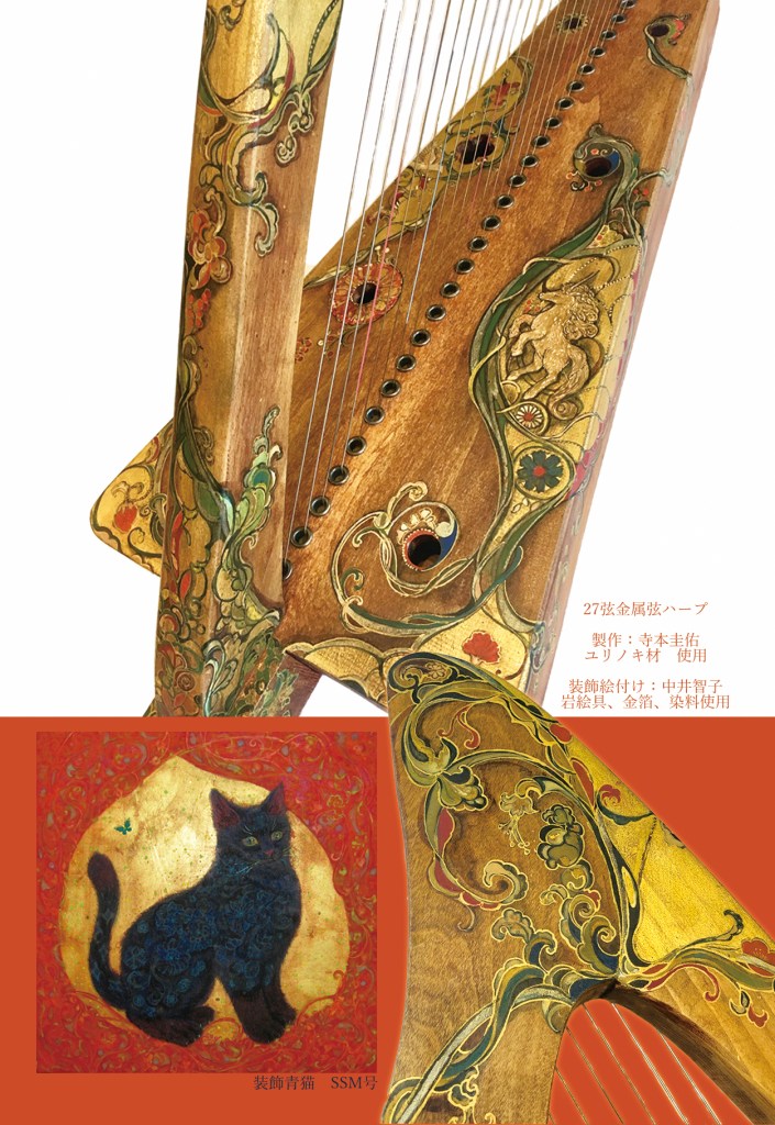 私の手作りのアイリッシュ・ハープと日本画家の妻、中井智子の日本画作品を展示販売いたします。日本画の岩絵具で美しい装飾を施したハープも多数出展。毎年ご好評いただいた展覧会で今回で3回目です。