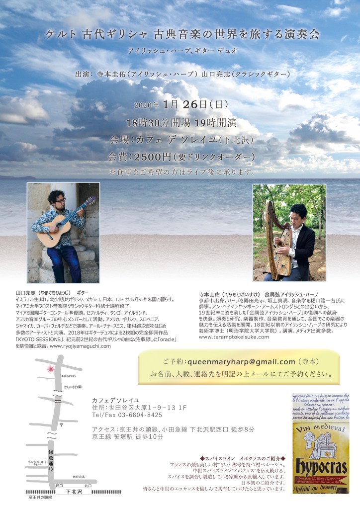 下北沢の「カフェデソレイユ」というお店で、ギターの山口亮志さんとのデュオです。3部構成で、第一部はアイリッシュ・ハープソロ、第二部はギターソロ、第三部はデュオを演奏する予定です。