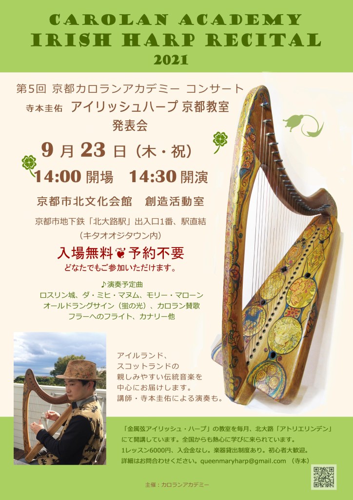 寺本圭佑アイリッシュ・ハープ京都教室の発表会を北大路の「北文化会館 創造活動室」にて開催。 7名の門下生による金属弦アイリッシュ・ハープの演奏、講師寺本圭佑による演奏もあります。