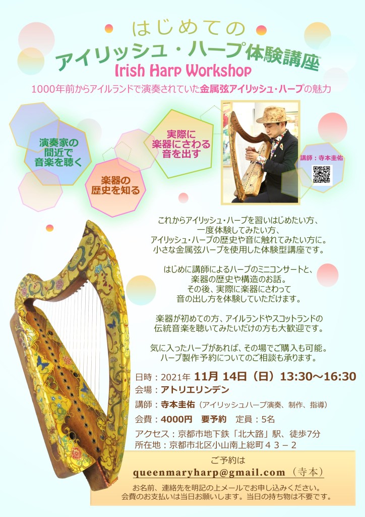 これからアイリッシュ・ハープを習いはじめたい方、一度体験してみたい方、アイリッシュ・ハープの歴史や音に触れてみたい方に。