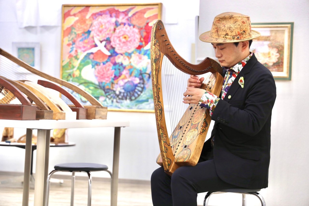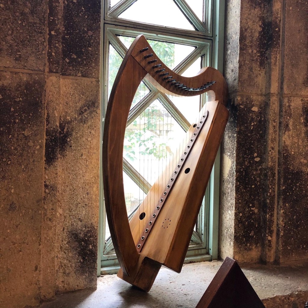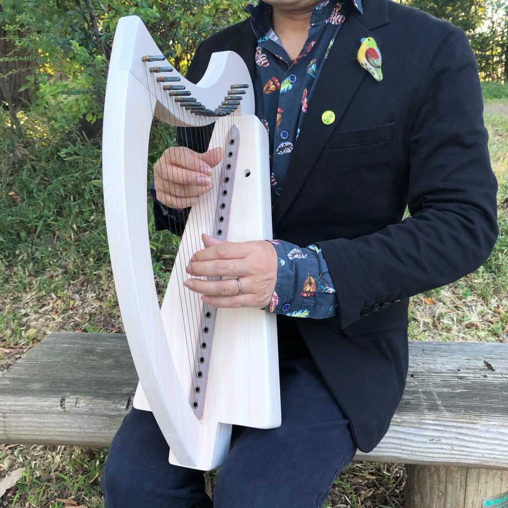 使用するのは私が製作している小さな金属弦ハープ。ハープ製作予約についてのご相談も承ります。