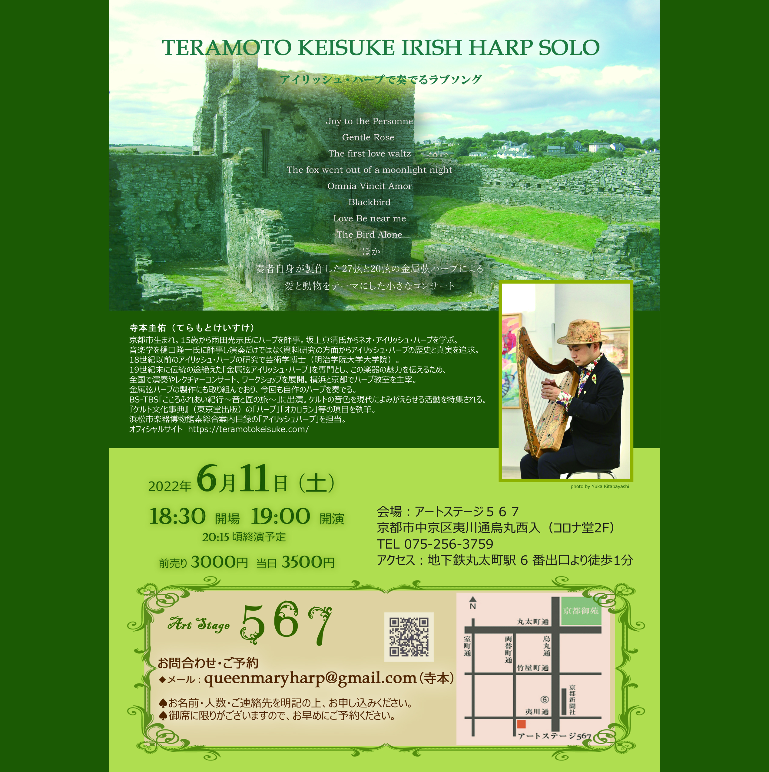 6月11日(土)19:00から丸太町 art stage 567 でハープソロコンサートを行います。毎月のように都内と京都でライブができるようになり嬉しく思います。かなり埋まってきていますので、ご希望の方はお早目のご予約をお願いします。