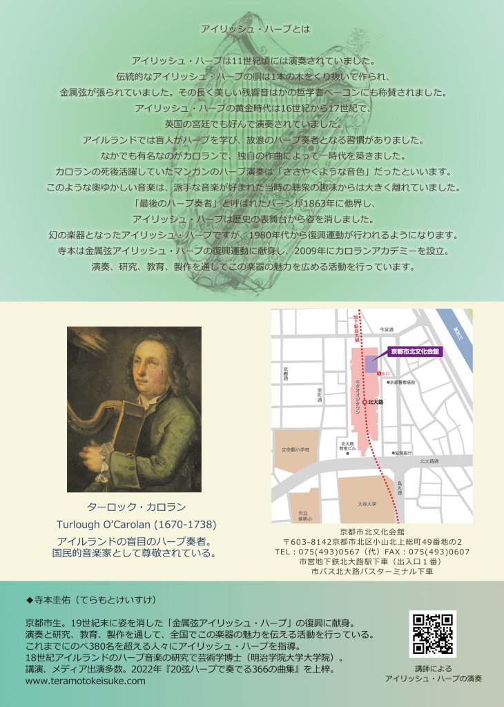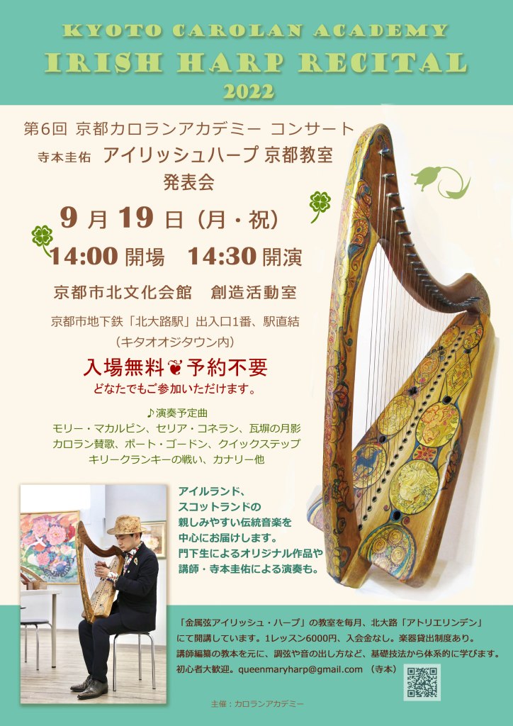 寺本圭佑アイリッシュ・ハープ京都教室の発表会を北大路の「北文化会館 創造活動室」にて開催。 11名の門下生による金属弦アイリッシュ・ハープの演奏、講師寺本圭佑による演奏もあります。