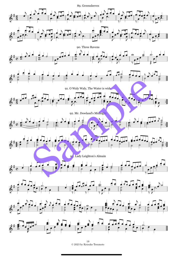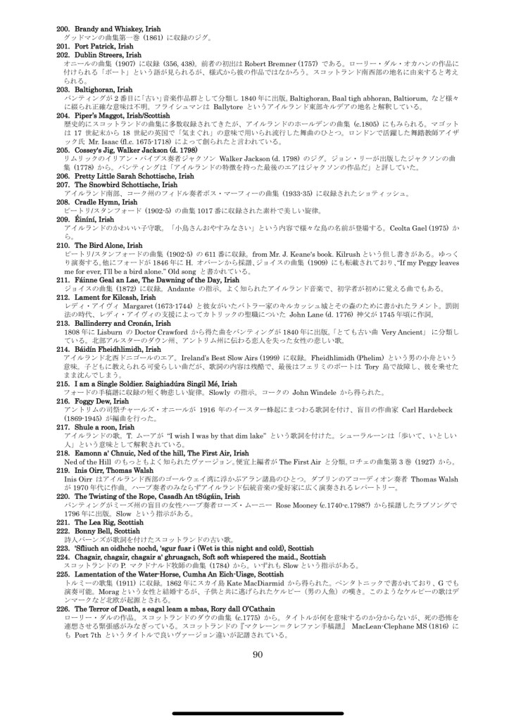 この曲集は私が設計、製作している12弦の小さな金属弦ハープ、アルト (G4-D6) のために編纂しました。アイルランドやスコットランドなどのケルト音楽と英国、スペインやギリシャ等の音楽が333曲集まりました。クリスマス音楽も多数収録しています。全曲中75曲は『20弦ハープで奏でる366の曲集』(2022) には未収録です。