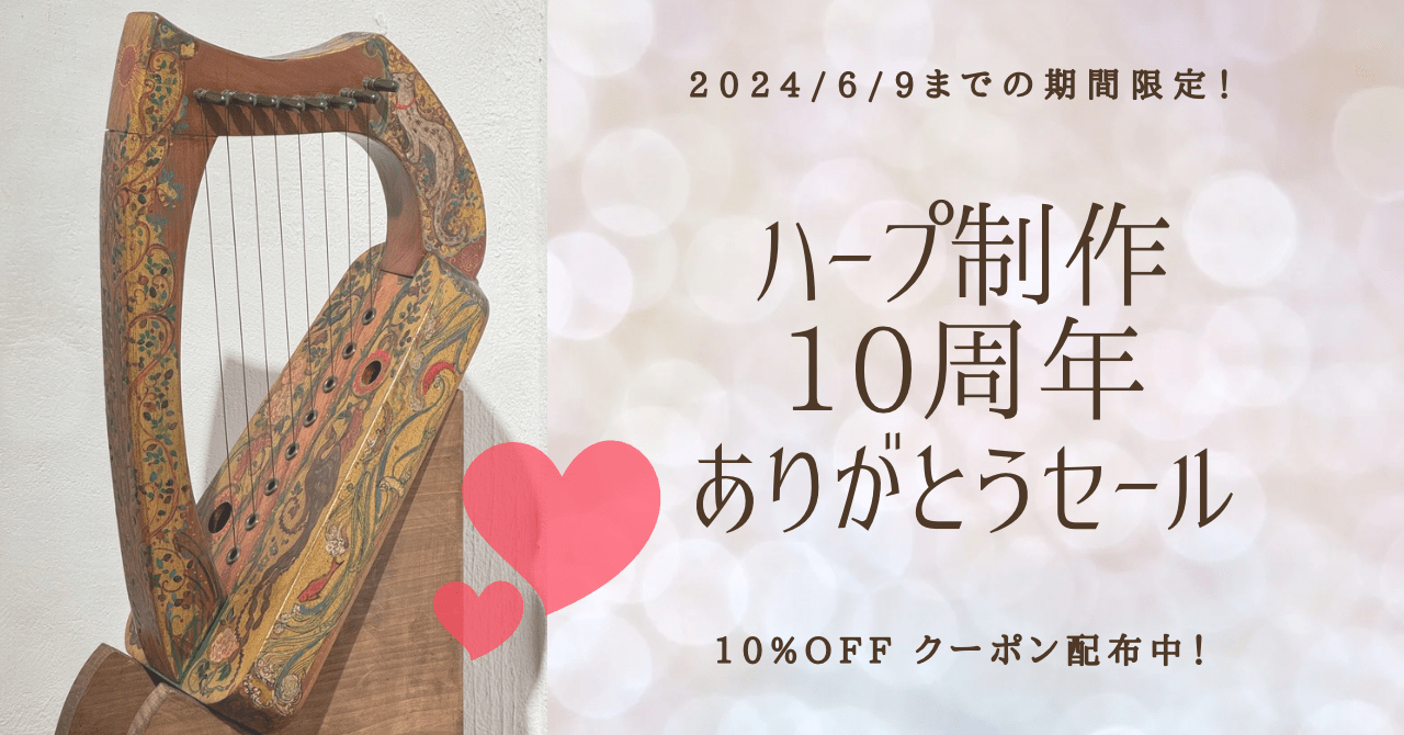 とめどない感謝の気持ち、そして、もっと多くの方にハープの音色を届けるため、ハープ制作10周年ありがとうセールの第2弾 を行います!今回は対象商品の10%offクーポンを発行します。前回、対象外だった美しい絵付けが施されたハープも一部使用可能です。ぜひこの機会にチェックしてみてください!